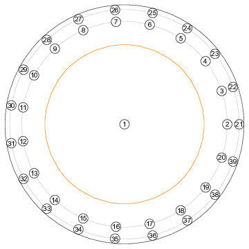 Figure 1: The geometry of the mirror actuators (for 39- and 38- channel version; 38-channel version doesn’t have the central actuator). Diameters of a) the external ring of actuators is 48 mm; b) internal ring of actuators is 43 mm; c) recommended light aperture (shown in orange) is 33 mm.