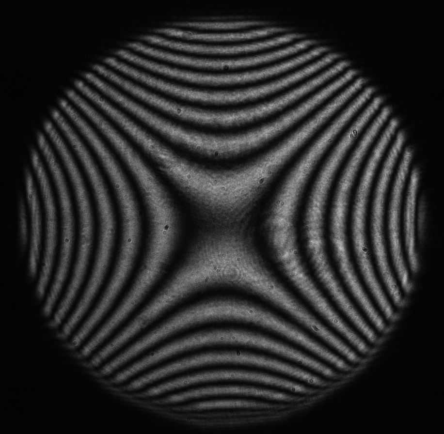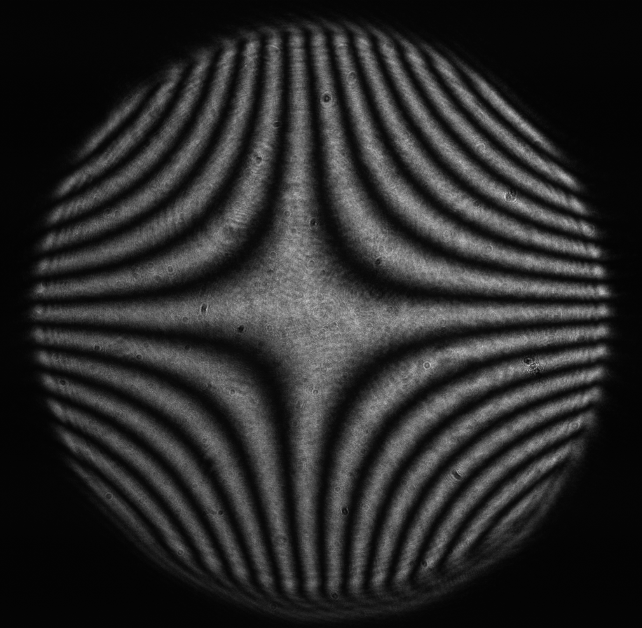 Figure 10: Astigmatism (Zernike term Z[2,2]) of amplitude 4.8μm generated. top: reconstructed wavefront (left) and simulated interferogram (right); simulated far field (left) and registered interferogram (right) .