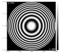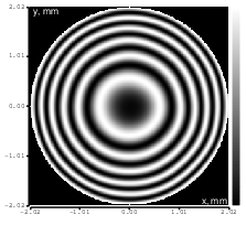 Figure 8: Defocus (Zernike term Z[2,0]) of amplitude 2.2μm generated. top: reconstructed wavefront (left) and simulated interferogram (right); simulated far field (left) and registered interferogram (right) .