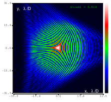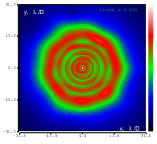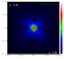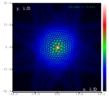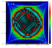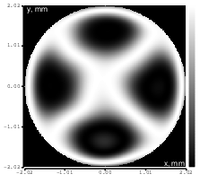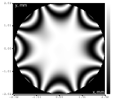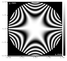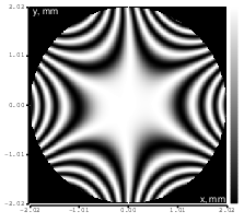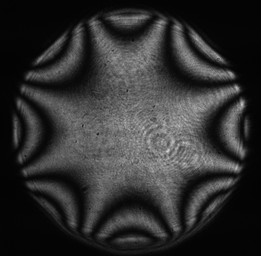 Figure 19: Zernike term Z[4,4] of amplitude 1.9μm generated. top: reconstructed wavefront (left) and simulated interferogram (right); simulated far field (left) and registered interferogram (right) .