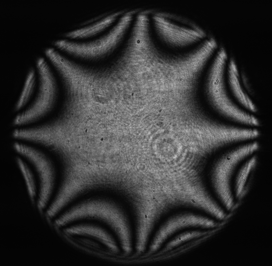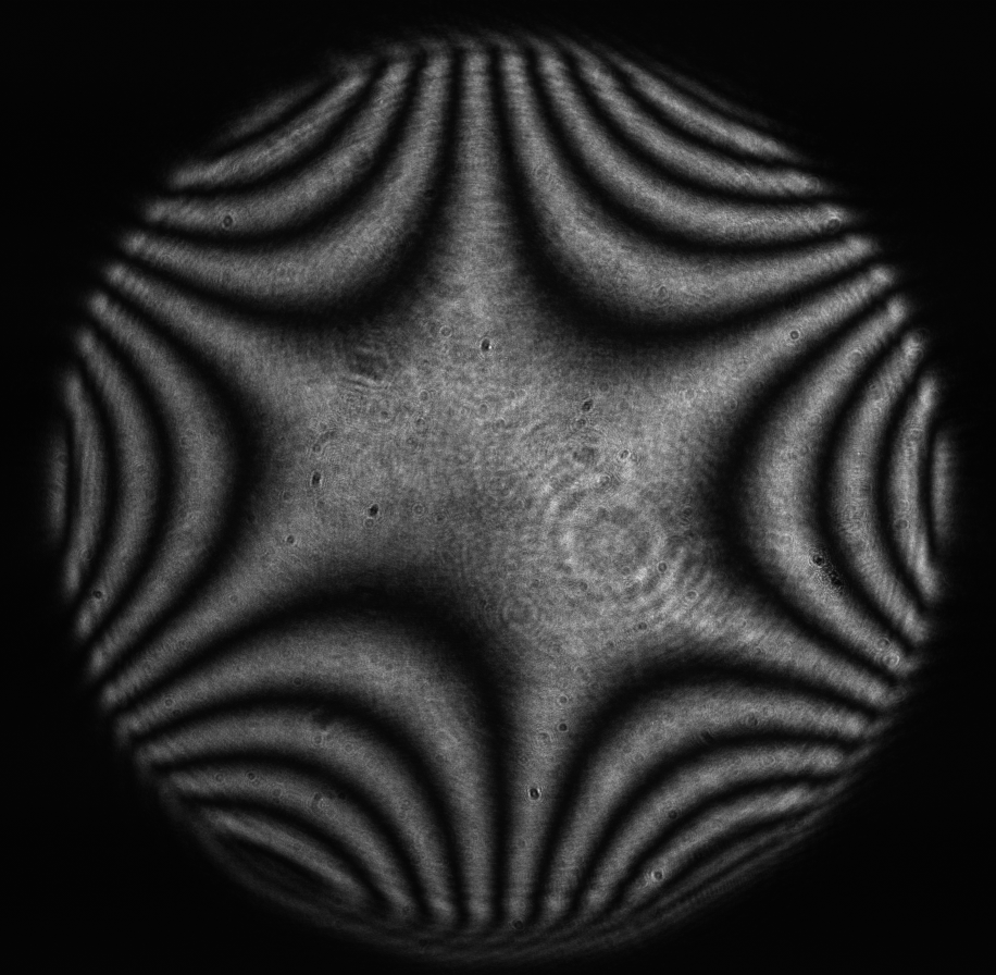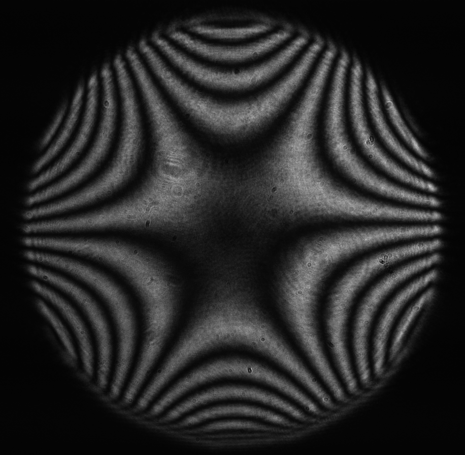 Figure 17: Zernike term Z[4,2] of amplitude 0.6μm generated. top: reconstructed wavefront (left) and simulated interferogram (right); simulated far field (left) and registered interferogram (right) .
