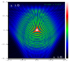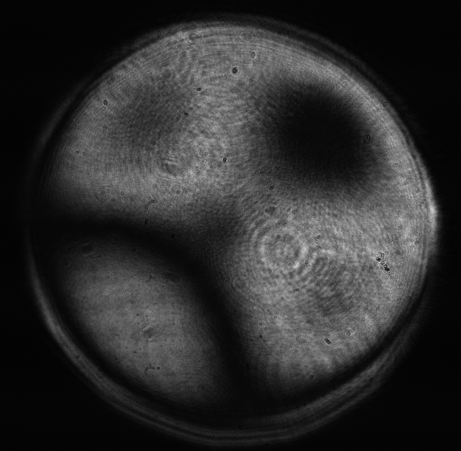 Figure 15: Trefoil (Zernike term Z[3,-3]) of amplitude 3.2μm generated. top: reconstructed wavefront (left) and simulated interferogram (right); simulated far field (left) and registered interferogram (right) .