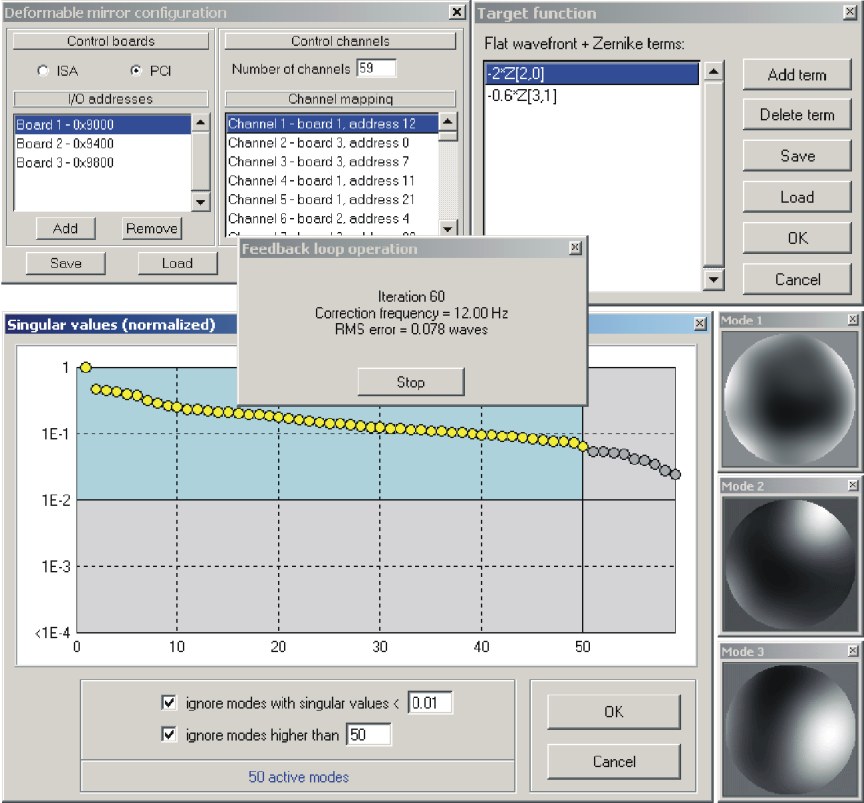 - Real-time control and compensation of wavefront aberrations in combination with OKO deformable mirrors. With most OKO mirrors the low-order Zernike modes can be corrected with a precision of λ/40 and better.