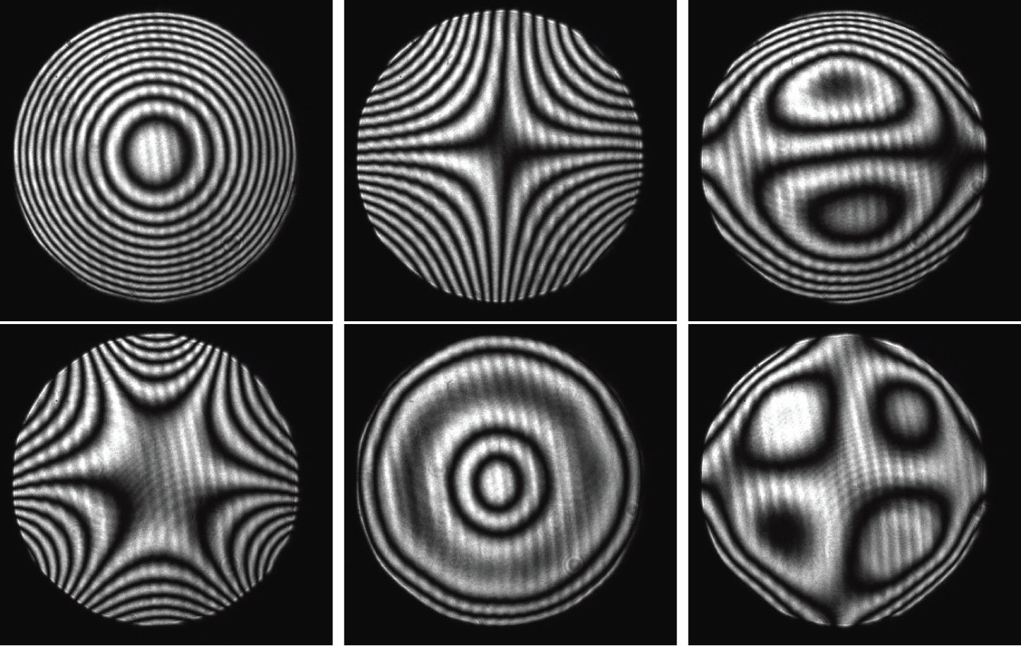 Figure 2: Interferometric patterns corresponding to low-order aberrations formed with the optimal 19-ch piezoelectric mirror: defocus, astigmatism,coma, trifoil, spherical aberration, Z24 (left to right, top to bottom).